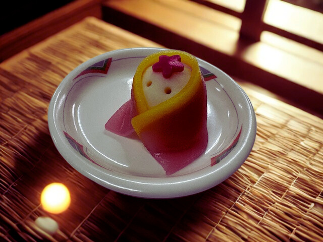 こちらの2枚目の写真は、食後にお出しした和菓子「女雛」。